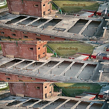 Op de tweede etage worden nog reparaties verricht. Hier wordt het vlechtstaal blootgelegd om nieuw vlechtstaal aan vast te maken, daarna wordt het gat gedicht. Dat gebeurt terwijl boven je hoofd ...