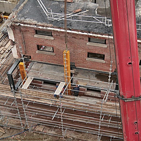 Op het dak is men begonnen met het hakken van gaten. Het grootste gedeelte van het dak moet er af.
