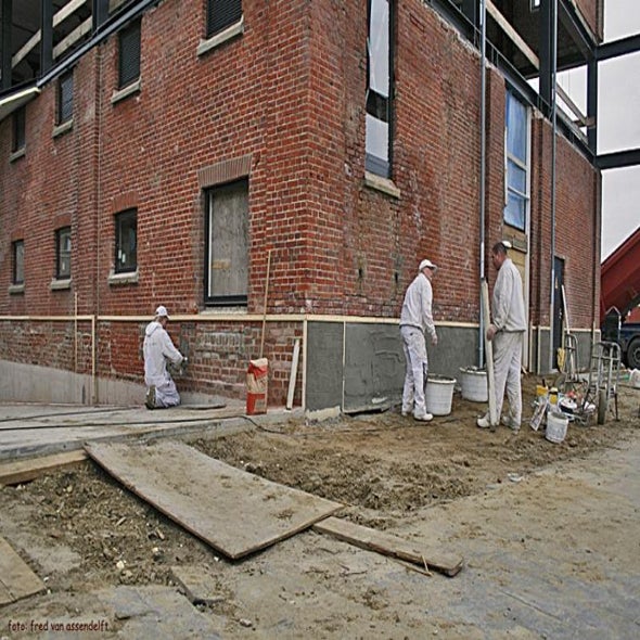 Beneden is men aan de west- en noordzijde bezig met het pleisteren van de benedenmuur.